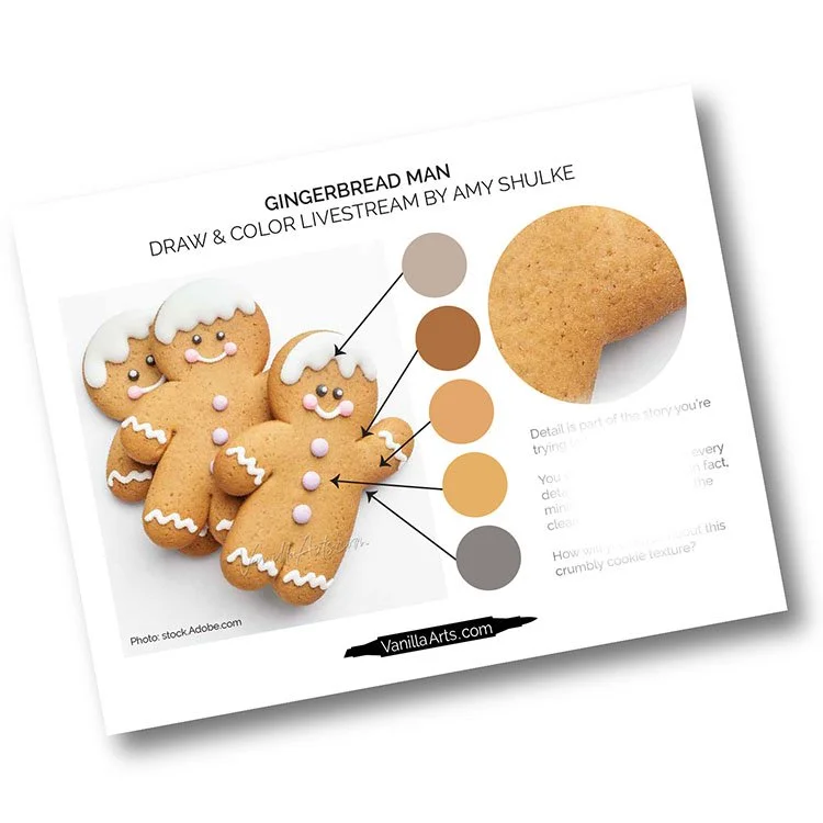 Get your copy of the primary photo reference for the Gingerbread Man project. Worksheet includes the photo plus color and texture prompts.