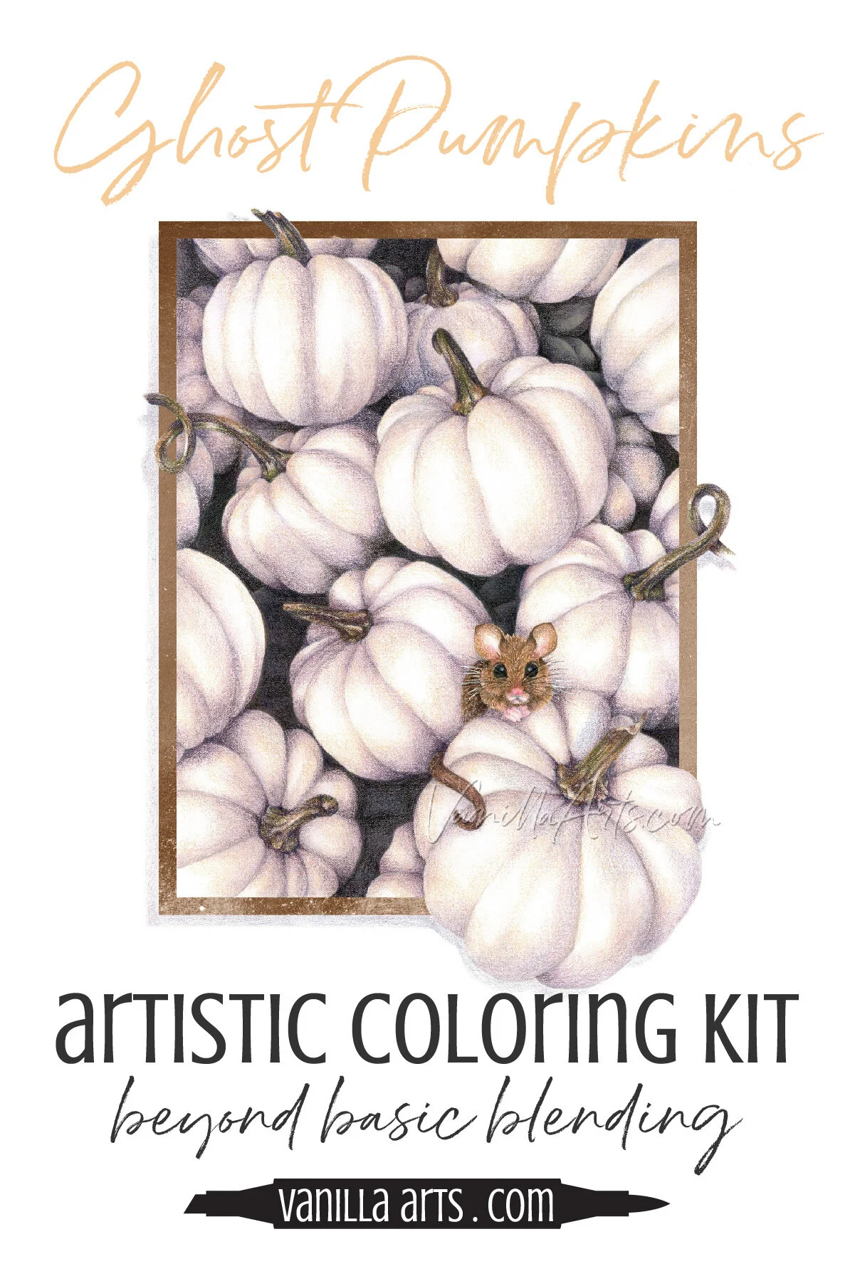 “Ghost Pumpkins” and the little stowaway critter were colored with watercolor and Holbein Colored Pencils