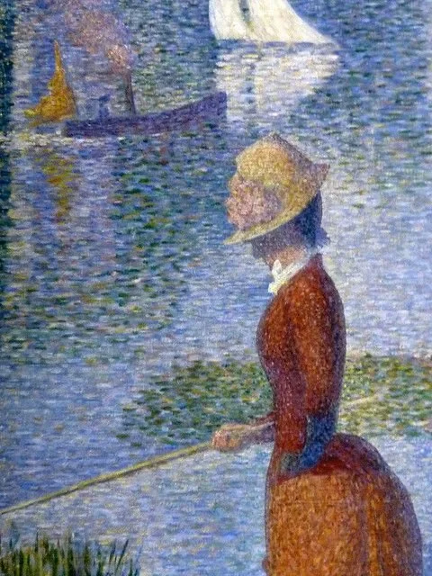 A color theory expert will look at the fishing woman in La Grande Jatte and talk about how the green lily pads are enhanced by the cool blue water and her warm russet dress.