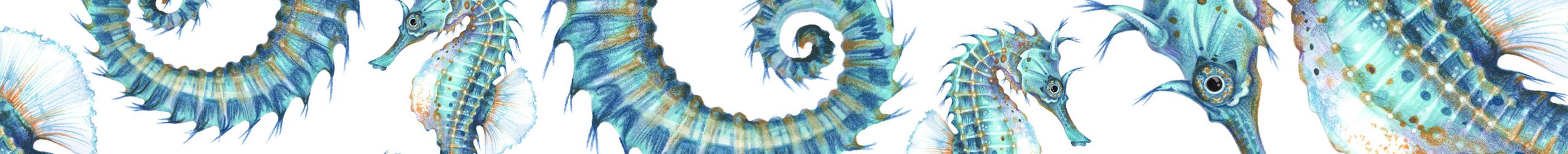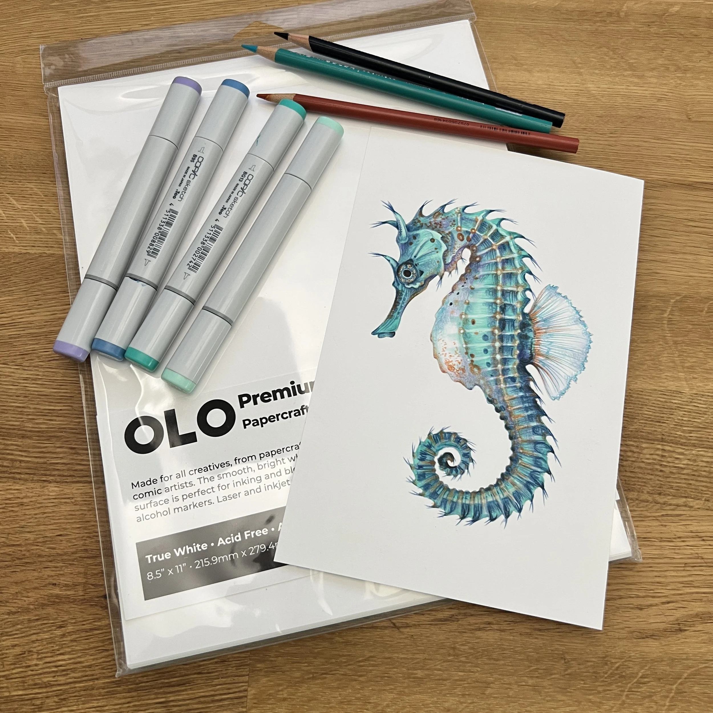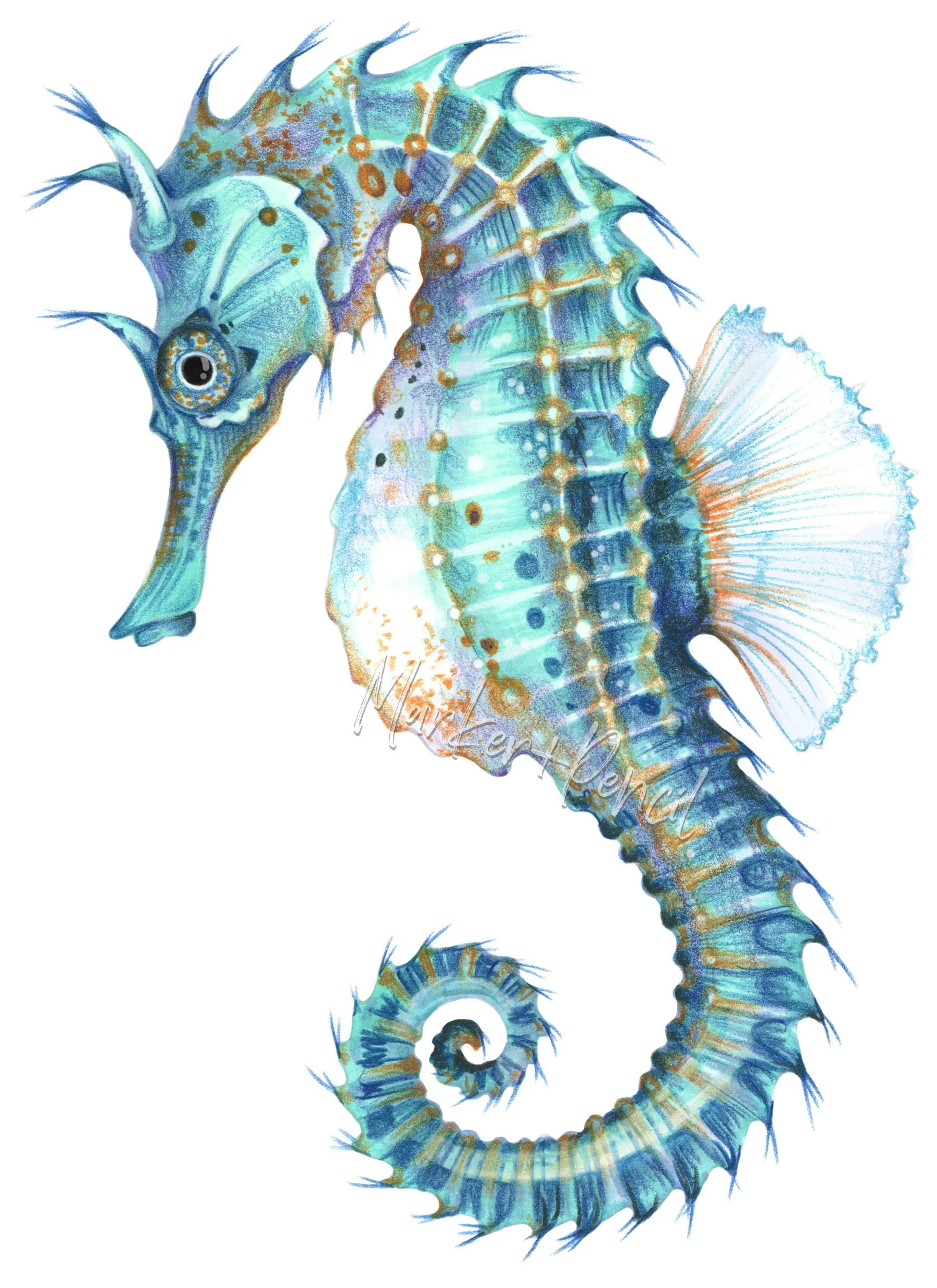 This seahorse isn’t just a couple of aqua markers and turquoise and turquoise pencils. To make blue-green look it’s best, you need a host of supporting colors.