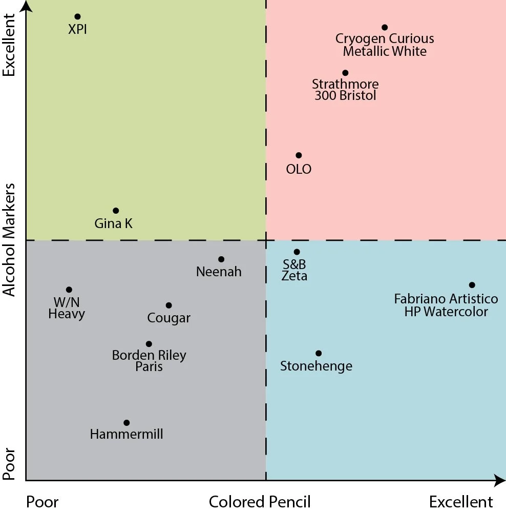 Markers prefer an ultra-smooth surface. Pencils like it rough. Good pencil paper will tear yo’ marker nibs apart. Meanwhile colored pencil on marker paper is like eating jello with a hot fork.