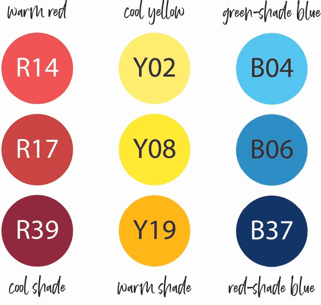 In the sample above, the yellow is the oddball. If you’re shading red and blue with cool red and cool blue, the yellow shade should look greenish, not orangish. Or you could stick with the yellow shade but then your red shade should look orangish and the blue shade should feel a bit teal.