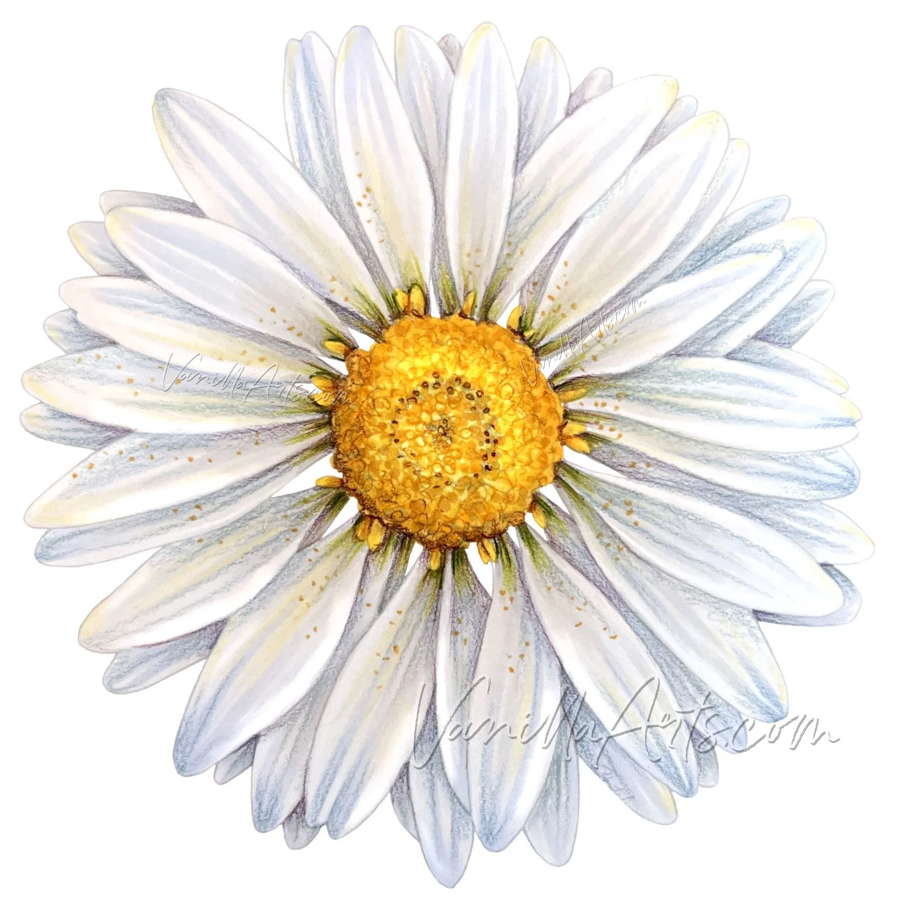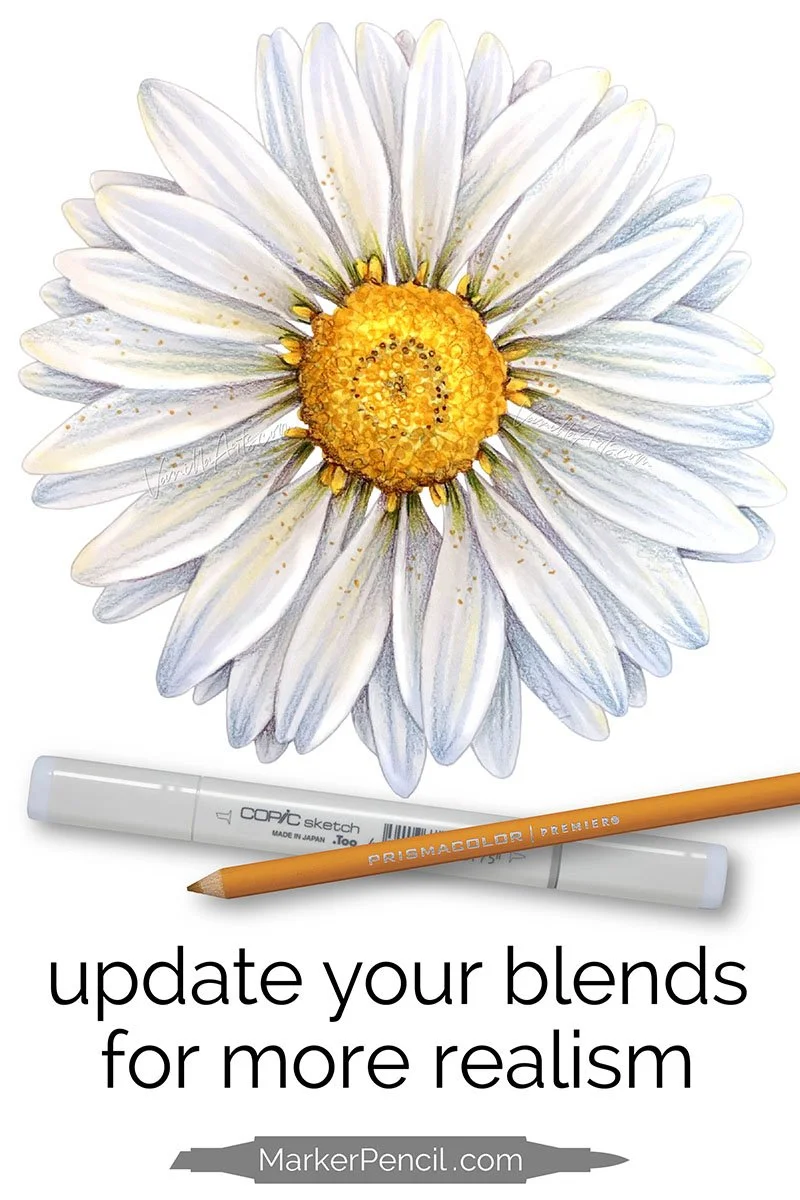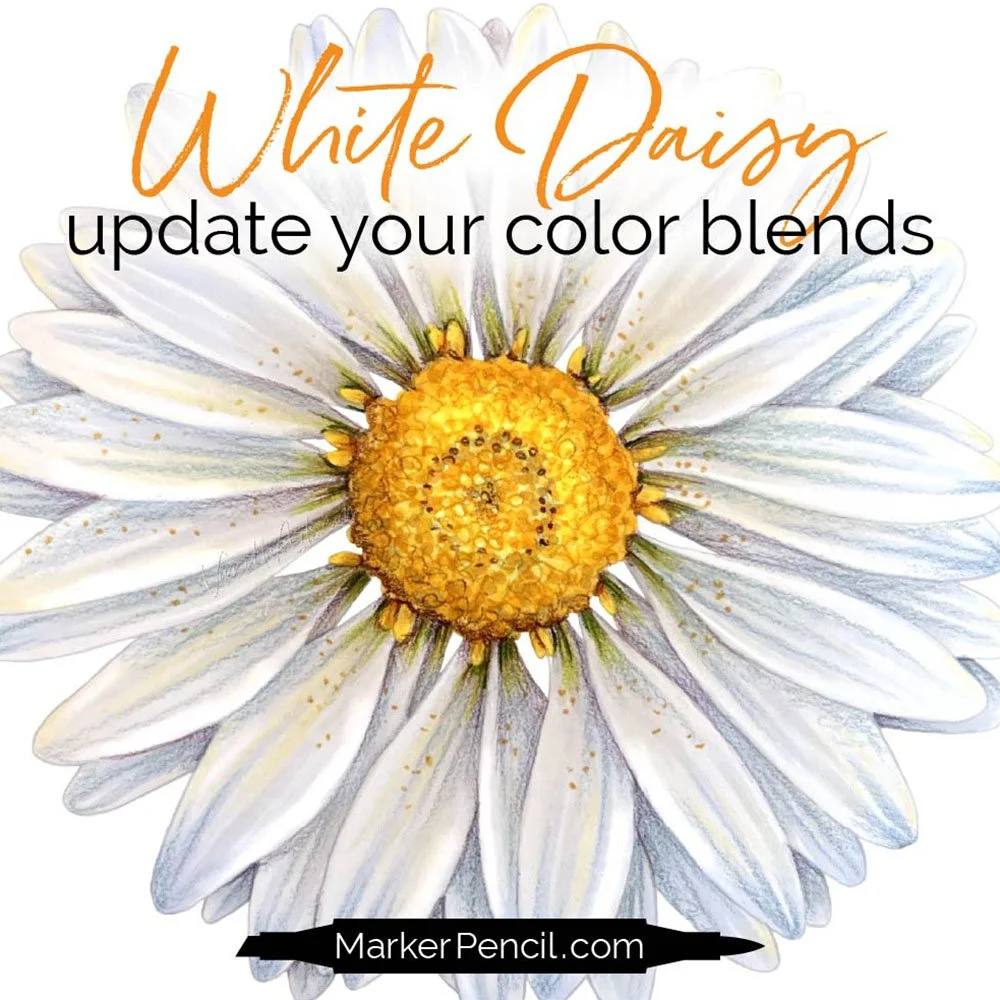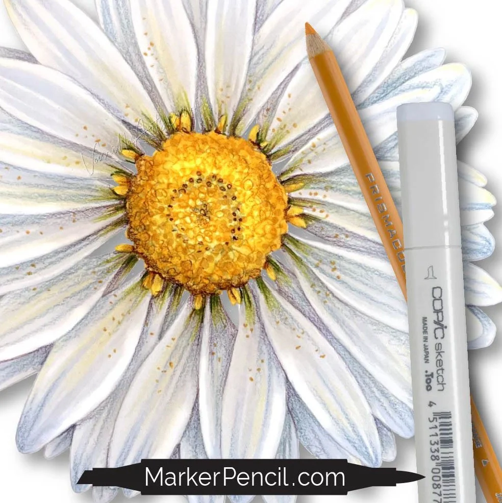“White Daisy” by the author, Amy Shulke. 6×6” on Bristol with Copic Markers and Prismacolor Pencils. Supply list and resources below.